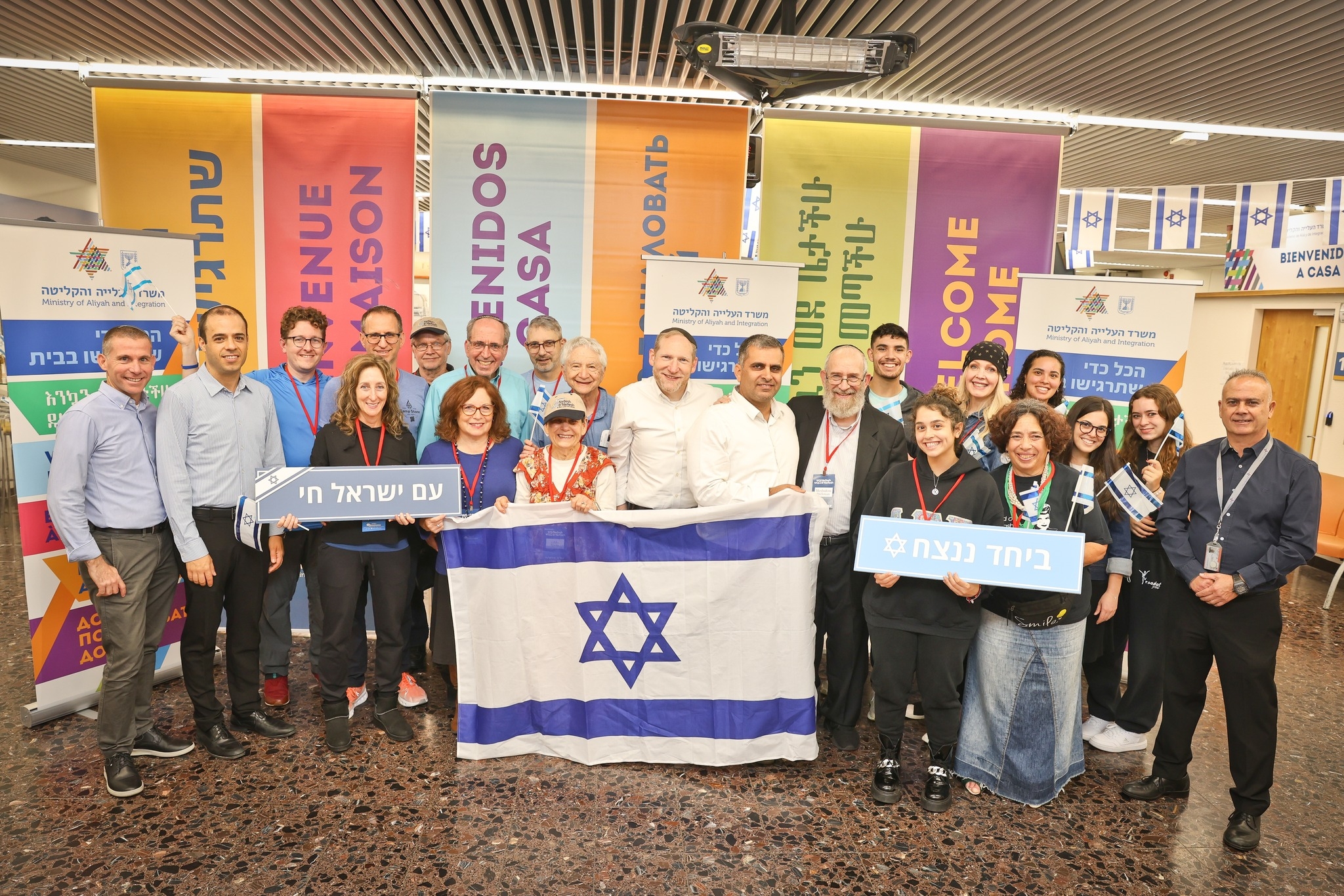 Le ministre israélien de l’Immigration, Ofir Sofer, pose à l’aéroport Ben Gourion avec certains des 25 nouveaux immigrants arrivés de New York le 19 octobre 2023, moins de deux semaines après qu’Israël a été plongé dans la guerre. (Avec l’aimable autorisation de Nefesh B’Nefesh)