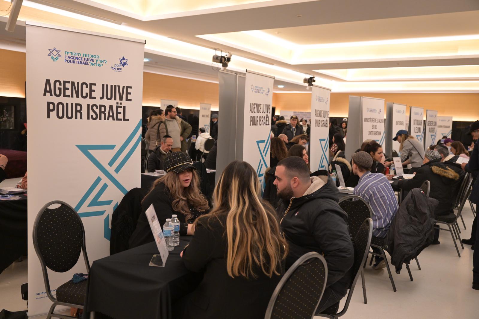 Les gens obtiennent des informations sur la possibilité de s’installer en Israël lors d’un salon de l’Agence juive en France en décembre 2023. (Autorisation de l’Agence juive pour Israël)