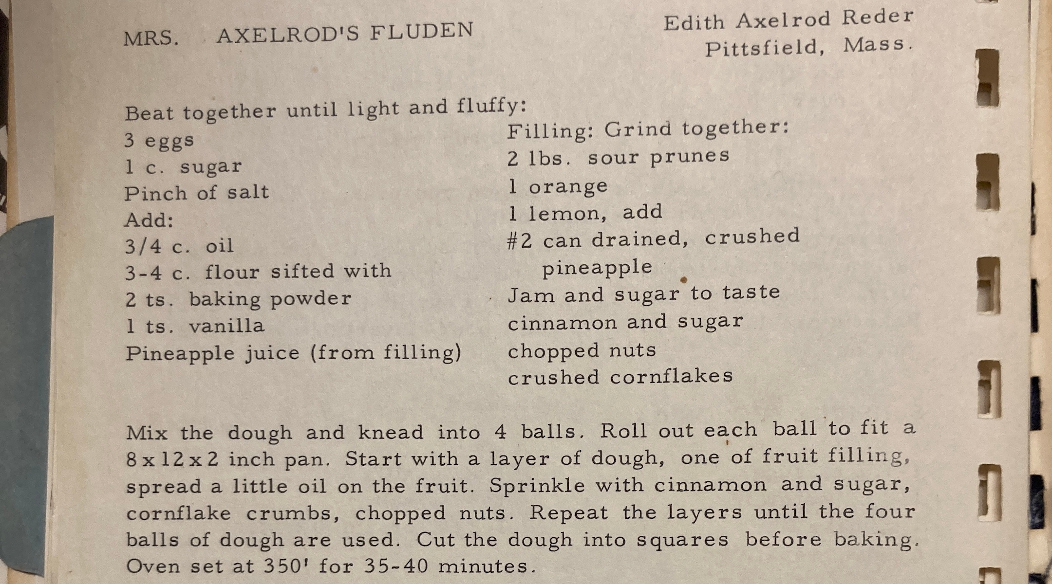 De nombreuses années plus tard, ma mère a rapporté avec enthousiasme qu’elle avait trouvé une recette de fluden dans « Le monde de la cuisine juive » de Gil Marks. Jusqu’alors, aucun livre de cuisine juive ne l’avait entièrement satisfaite, puisqu’elle n’avait jamais trouvé de fluden dans l’index.