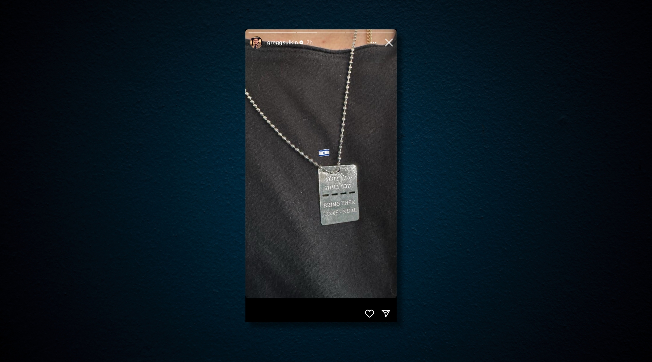 L’acteur juif britannique Gregg Sulkin a partagé une photo d’une plaque d’identité d’un otage et d’un emoji du drapeau israélien lors de sa visite en Israël mercredi. 19 décembre 2023. (Capture d’écran via Instagram Stories)