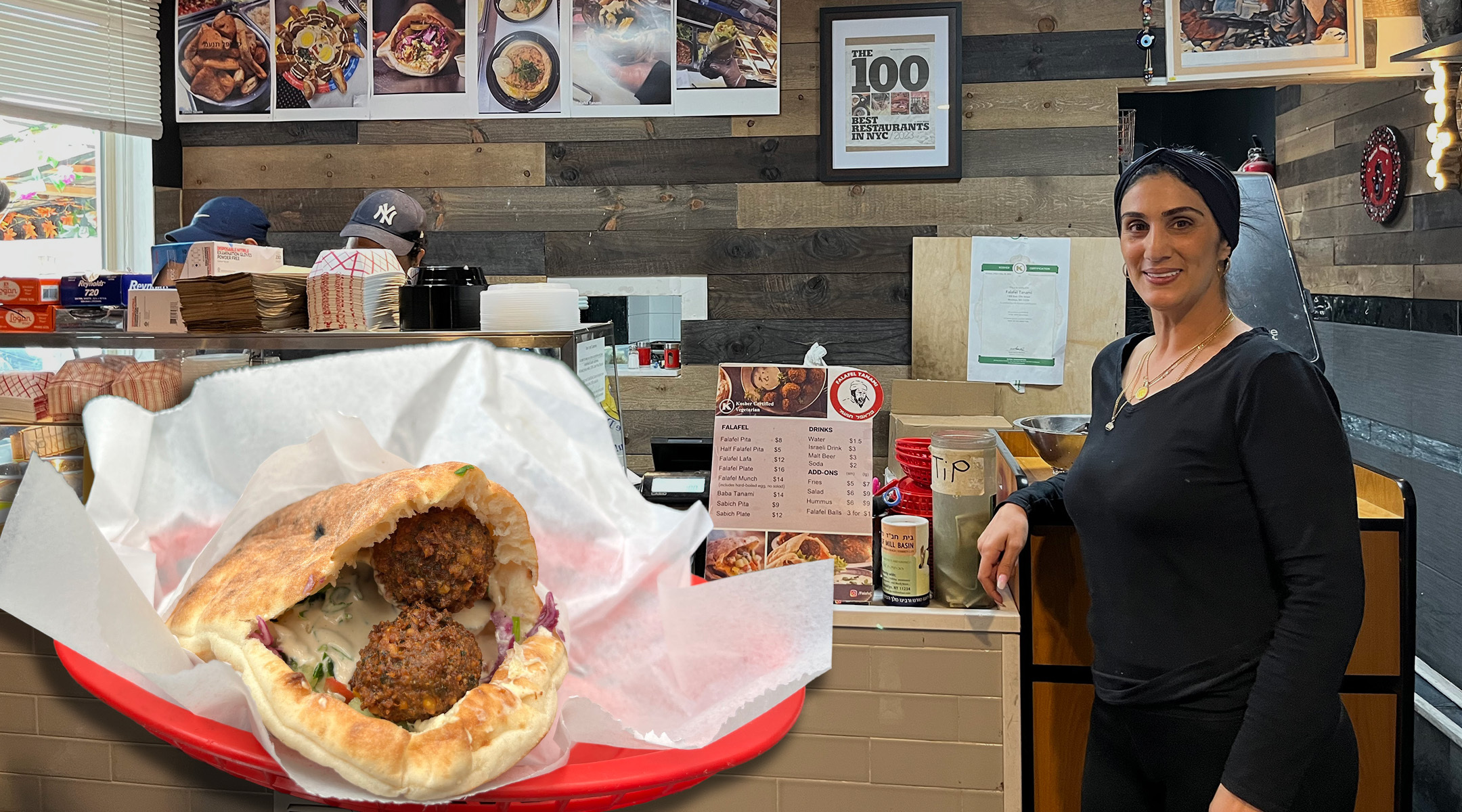 Galit Tanami, la propriétaire du Falafel Tanami, est représentée dans son restaurant, qui a été nommé en avril l’un des 100 meilleurs restaurants de la ville par le New York Times. (Julia Gergely, conception de Mollie Suss)