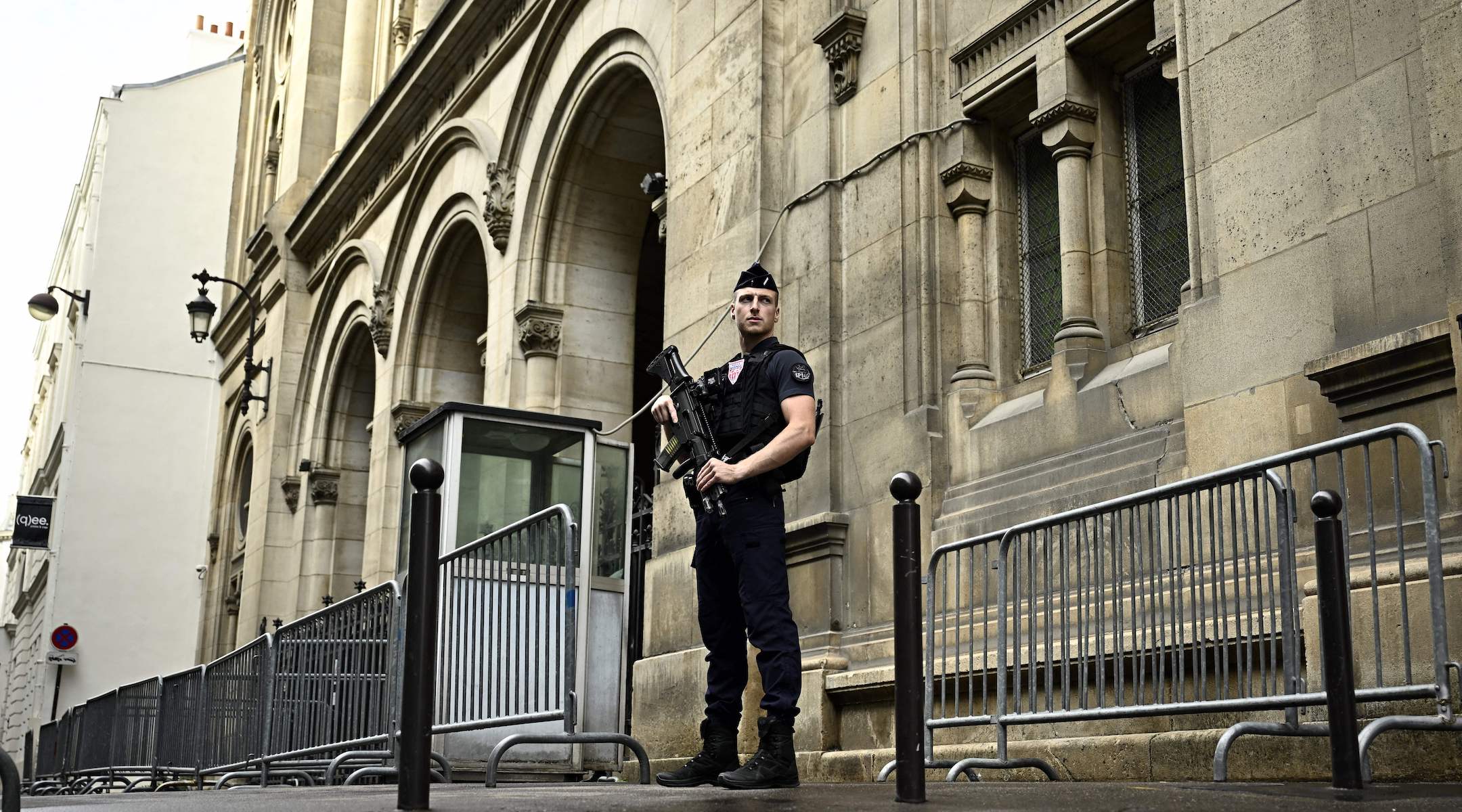 Un policier français monte la garde devant la synagogue de Paris, le 9 octobre 2023. (Julien De Rosa/AFP via Getty Images)