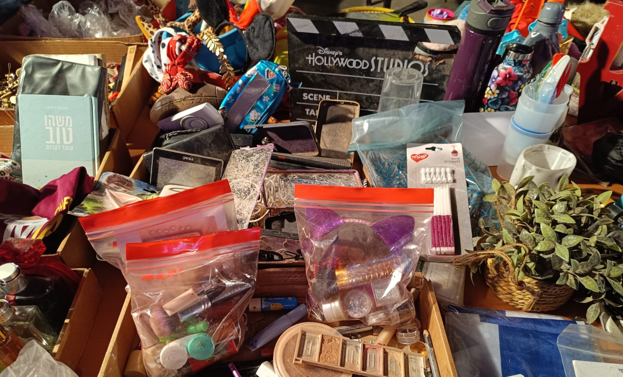 Des objets personnels abandonnés lors du festival de musique trance Nova, où des centaines de personnes ont été tuées par le Hamas le 7 octobre, sont rassemblés dans un véritable espace objets trouvés lors d’une exposition sur le massacre. (Eliyahu Freedman)