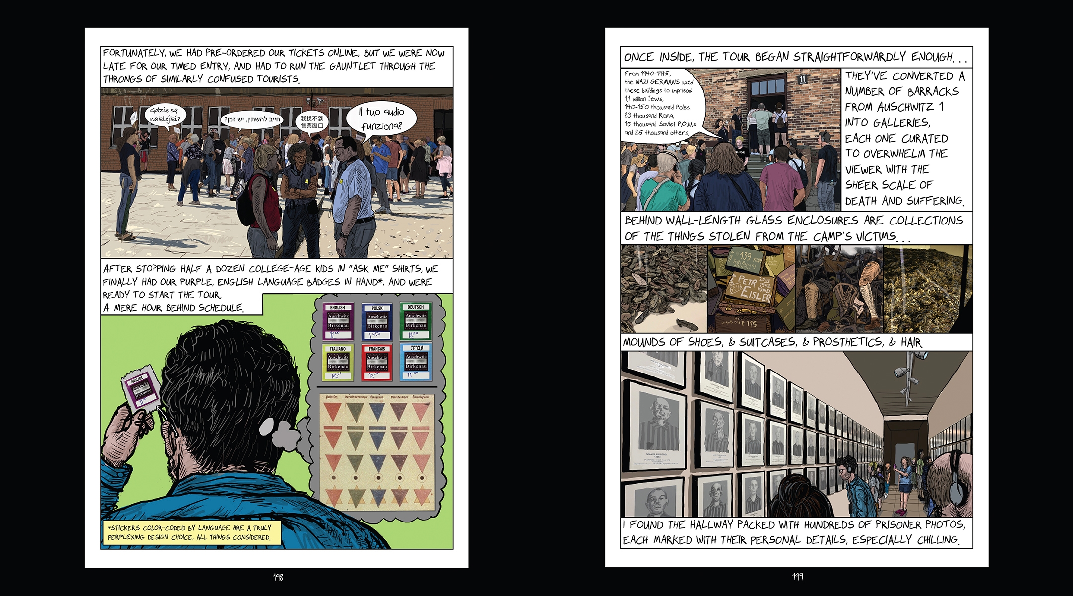 Une planche de « Plus jamais je visiterai Auschwitz » présente la visite guidée du complexe du camp par l’auteur. (Livres Fantagraphics, Inc.)